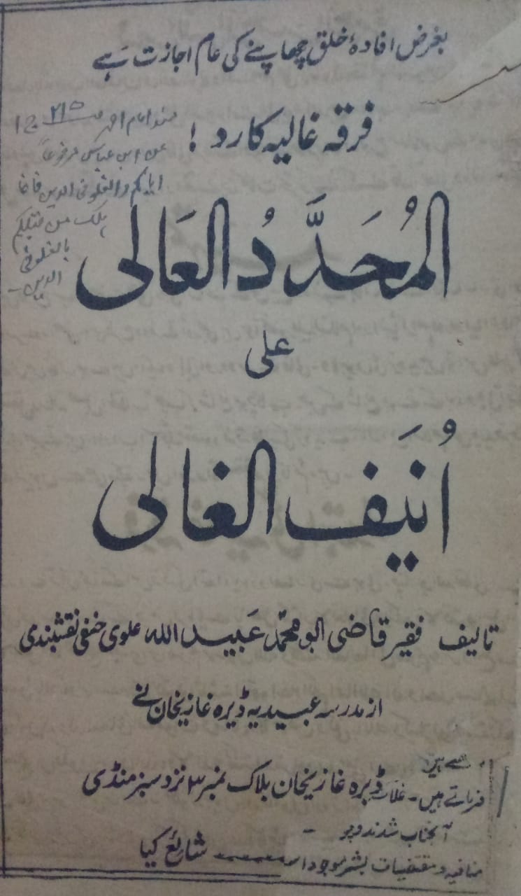 Hazrat Mufti Qazi Ubaidullah Alawi Naqshbandi Mujtahid رحمۃ اللہ علیہ had an unforgettable role in the defense of the finality of prophethood (Khatm-e-Nubuwwat) in the Indian subcontinent, i.e., Pakistan and India. His following achievements in the cause of Khatm-e-Nubuwwat will be written in golden letters: