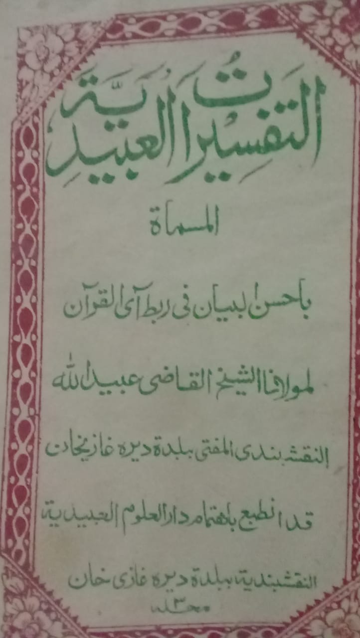 Mufti Qazi Ubaidullah (رحمۃ اللہ علیہ) compiled an Arabic tafsir of the Holy Qur’an titled Al-Tafāsīrāt al-‘Ubaidiyyah, consisting of one volume with 224 pages. In its introduction, he explains that the work aims to highlight the coherence and interrelation between Qur’anic verses and surahs—an aspect often overlooked by earlier scholars. Recognizing the need for clarity and unity in interpretation, he undertook this effort to aid understanding and spiritual reflection. Qari Muhammad Tahir Rahimi Multani praised this tafsir, noting its distinct scholarly merit and describing it as a unique contribution to the knowledge of Qur’anic harmony.